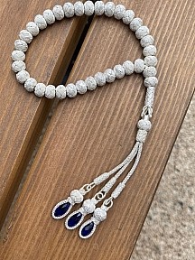 1000 ayar gümüş el örgüsüdür. ; Tesbihimiz geleneksel kazaziye sanatına uygun tekniklerle hazırlanmıştır. ; Her aşaması ayrı bir emek olan kazaziye sanatı nesiller boyu kültürel miras olarak taşınmıştır. ; Saç teli kalınlığındaki gümüş tellerin geleneksel kazaziye sanatına uygun tekniklerle sarılarak uygun kalınlığa gelmesinin ardından bu tellerin elde örülmesiyle hazırlanmıştır.Ortalama 40 gramdır, boyu ortalama 24 cm'dir. ; Habbe ölçüsü 9 mm'dir.Gümüş ürenlerin insan vücuduna iyi geldiği bilinmektedir. ; Antibakteriyel ve antistres özellikleri nedeniyle günümüzde tercih edilmektedir. ; Gümüş ürünler dayanıklı ve ömürlüktür.;