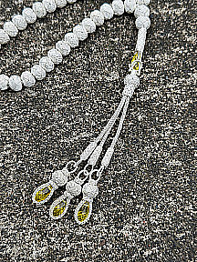 1000 ayar gümüş el örgüsüdür. ; Tesbihimiz geleneksel kazaziye sanatına uygun tekniklerle hazırlanmıştır. ; Her aşaması ayrı bir emek olan kazaziye sanatı nesiller boyu kültürel miras olarak taşınmıştır. ; Saç teli kalınlığındaki gümüş tellerin geleneksel kazaziye sanatına uygun tekniklerle sarılarak uygun kalınlığa gelmesinin ardından bu tellerin elde örülmesiyle hazırlanmıştır. ; Ortalama 40 gramdır, boyu ortalama 24 cm'dir. ; Habbe ölçüsü 8 mm'dir. ; Gümüş ürenlerin insan vücuduna iyi geldiği bilinmektedir. ; Antibakteriyel ve antistres özellikleri nedeniyle günümüzde tercih edilmektedir. ; Gümüş ürünler dayanıklı ve ömürlüktür.;