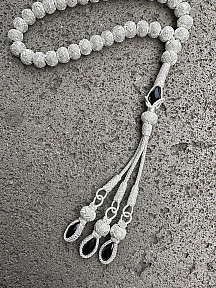 1000 ayar gümüş el örgüsüdür. ; Tesbihimiz geleneksel kazaziye sanatına uygun tekniklerle hazırlanmıştır. ; Her aşaması ayrı bir emek olan kazaziye sanatı nesiller boyu kültürel miras olarak taşınmıştır. ; Saç teli kalınlığındaki gümüş tellerin geleneksel kazaziye sanatına uygun tekniklerle sarılarak uygun kalınlığa gelmesinin ardından bu tellerin elde örülmesiyle hazırlanmıştır. ; Ortalama 40 gramdır, boyu ortalama 24 cm'dir. ; Habbe ölçüsü 8 mm'dir. ; Gümüş ürenlerin insan vücuduna iyi geldiği bilinmektedir. ; Antibakteriyel ve antistres özellikleri nedeniyle günümüzde tercih edilmektedir. ; Gümüş ürünler dayanıklı ve ömürlüktür.;